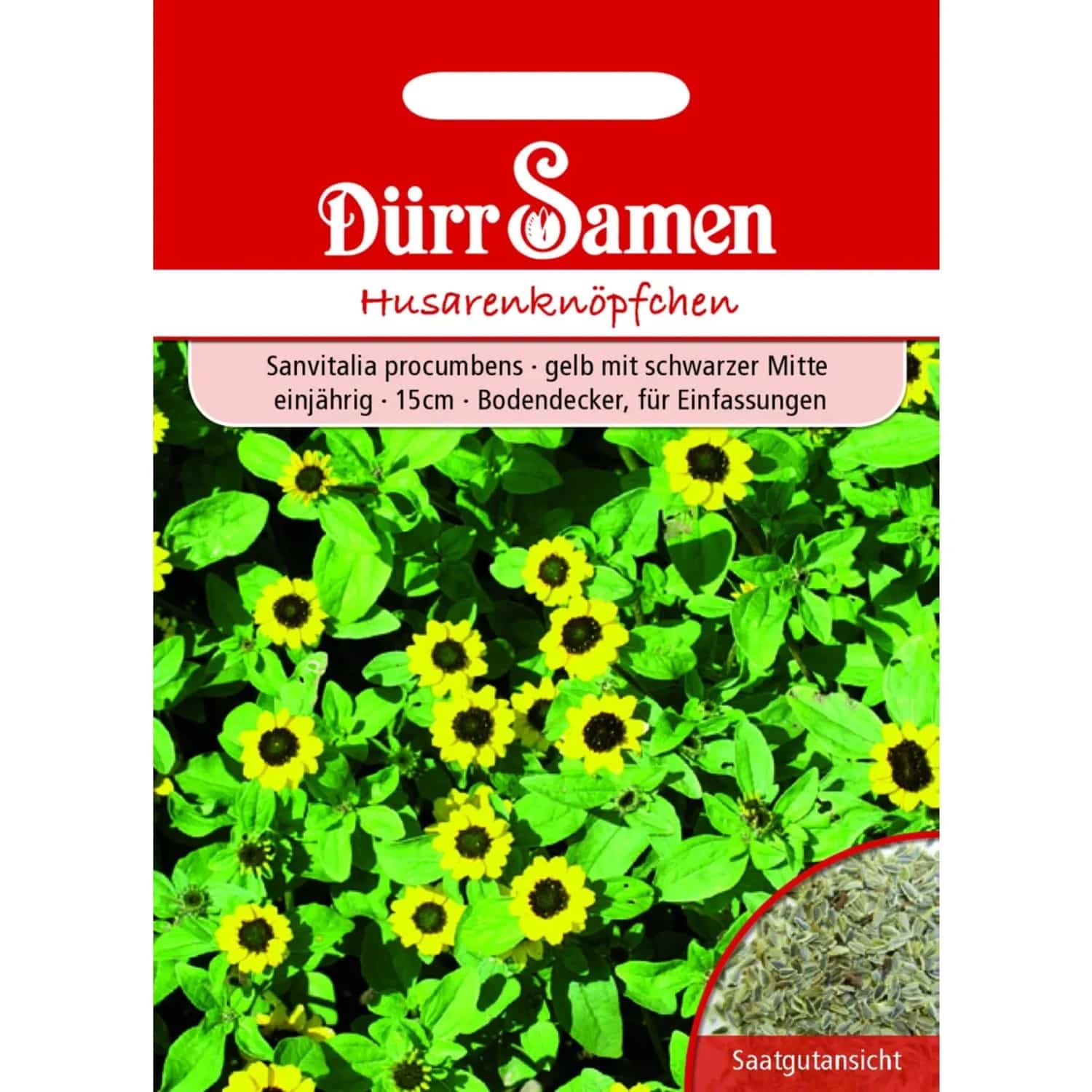 Entdecken Sie die leuchtende Schönheit der Husarenknöpfchen (Sanvitalia procumbens) von Dürr Samen und verleihen Sie Ihrem Garten, Balkon oder Ihren Kübeln eine sonnige Ausstrahlung. Dieses einjährige Saatgut ist ideal für Gartenfreunde, die unkomplizierte und langblühende Akzente setzen möchten, sei es als Bodendecker, in Ampeln oder in klassischen Blumenbeeten. Die charakteristischen, gelben Blüten mit ihrer auffälligen schwarzen Mitte erinnern an kleine Sonnen und bringen garantiert gute Laune.